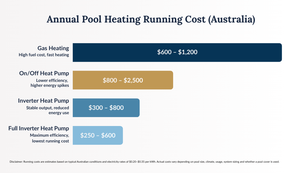 Running costs typically range between $2 and $8 per day in Australia, depending on pool size, climate, electricity rates and usage. In addition, high efficiency inverter systems reduce energy consumption by adjusting output to maintain temperature more efficiently.