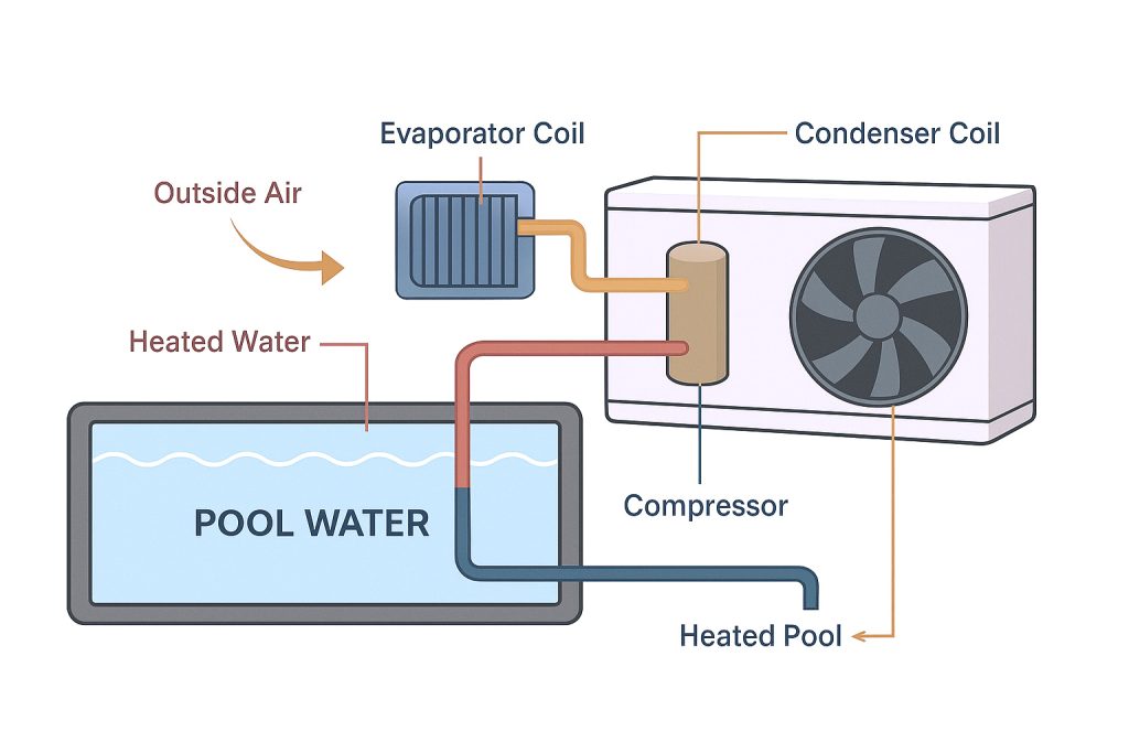 A pool heat pump works like a reverse air conditioner. It extracts heat from the air, transfers it to the pool water, and uses only a small amount of electricity to run the compressor and fan. Unlike gas heaters, heat pumps don’t burn fuel—they move heat, making them far more efficient.